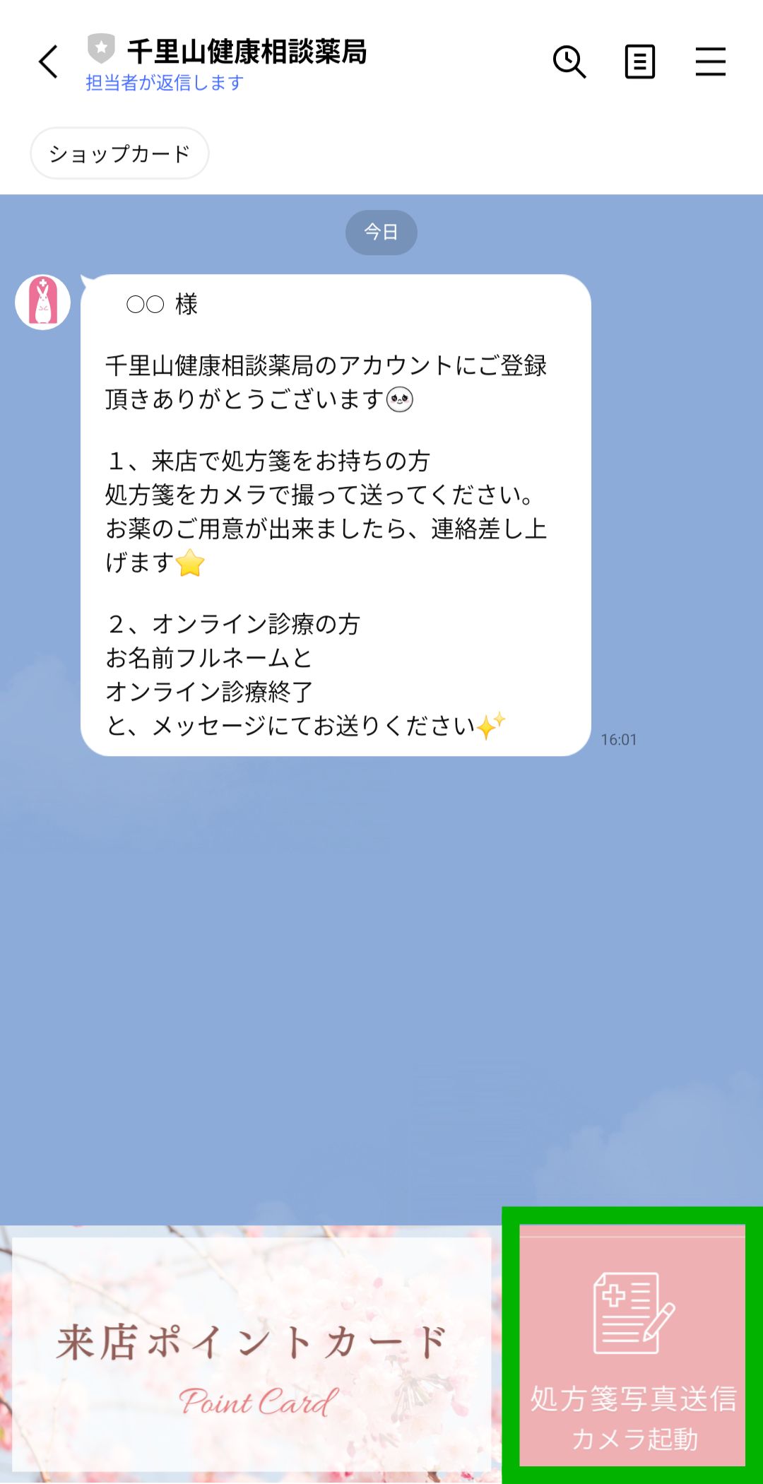 画面右下「処方箋写真送付カメラ起動」をタップし、病院で受け取った処方箋をスマートフォンで撮影します。そのままLINEで送信します。