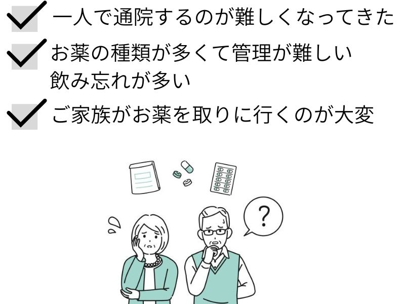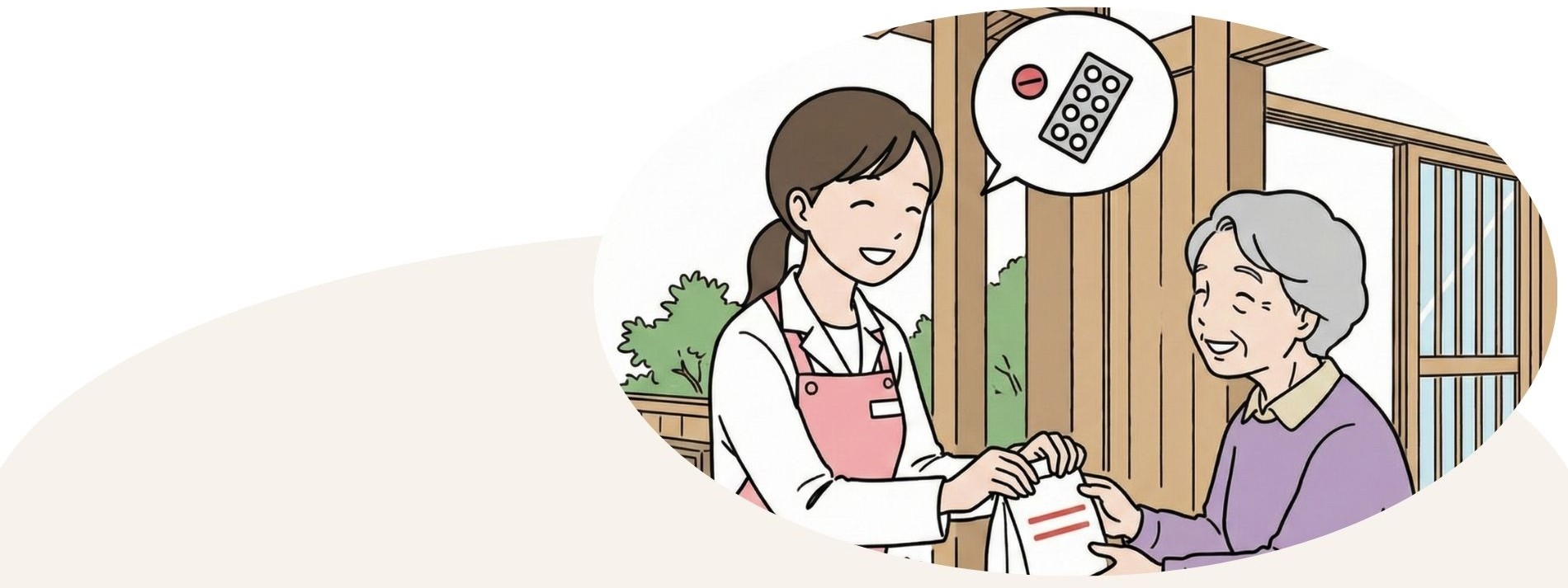 お薬の管理や服薬のサポート、日頃のお悩みやお困りごとのご相談も承ります。